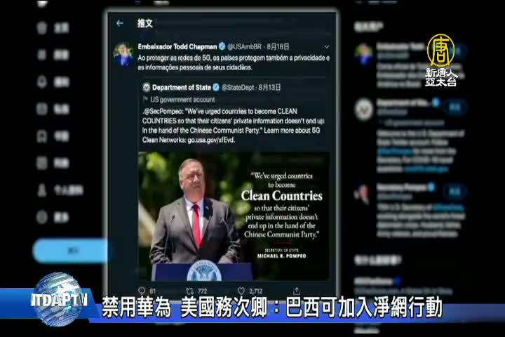 【新唐人亞太台 2020 年 08 月 24 日訊】好,美國政府推行的「清潔網絡」全球倡議,不少國家紛紛響應加入,主要負責經濟發展、能源和環保的,美國國務次卿克拉奇,近日發表聲明,呼籲巴西禁用華為5G設備,加入國際淨網行動。