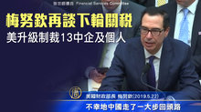 2019-05-23 21:11:30新聞一開始,帶您鎖定。美國商務部將華為等中企列入黑名單後,美國國務院今天(23日)再宣布,對13個中企或個人實施制裁。而美中除了科技戰之外,繼續帶您關注美中貿易談判本身的最新進展。美國財政部長梅努欽(22號)表示,如果中方想要重啟談判,就必須以先前談判的成果為基礎,進行談判。