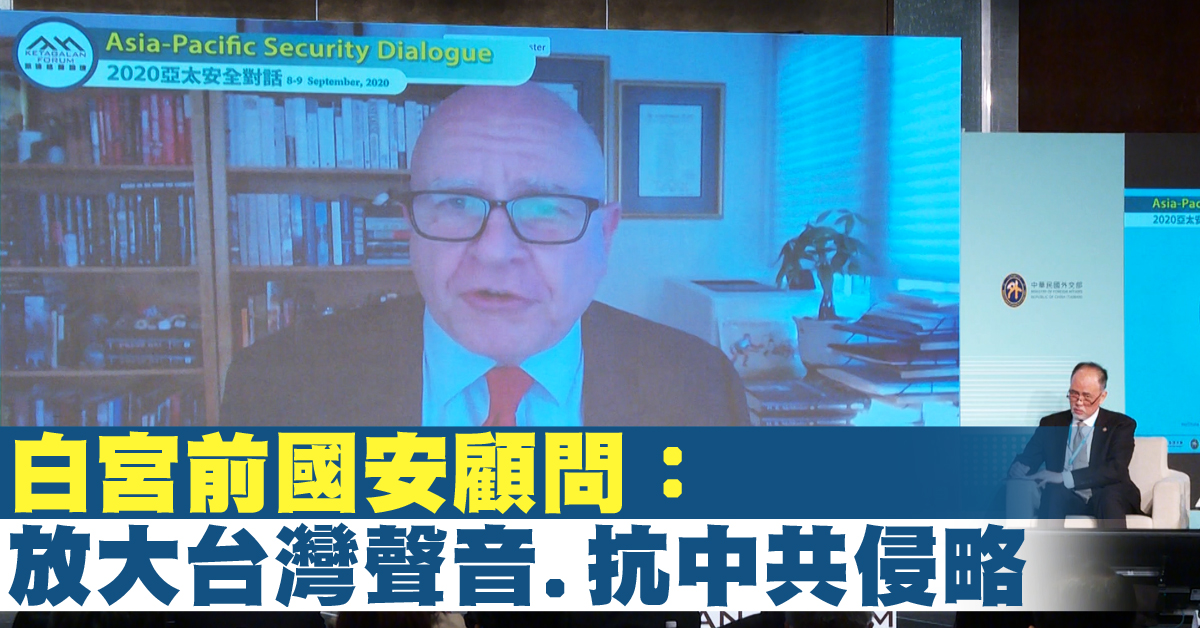 【新唐人亞太台 2020 年 09 月 08 日訊】「凱達格蘭論壇-2020亞太安全對話」週二(8日)起於台北登場,美國前國安顧問 麥克馬斯特(H. R. McMaster)在演說中細數中共威脅世界、在中國執行群體滅絕罪行,他提出「三點加強」台灣的聲音,對抗中共。