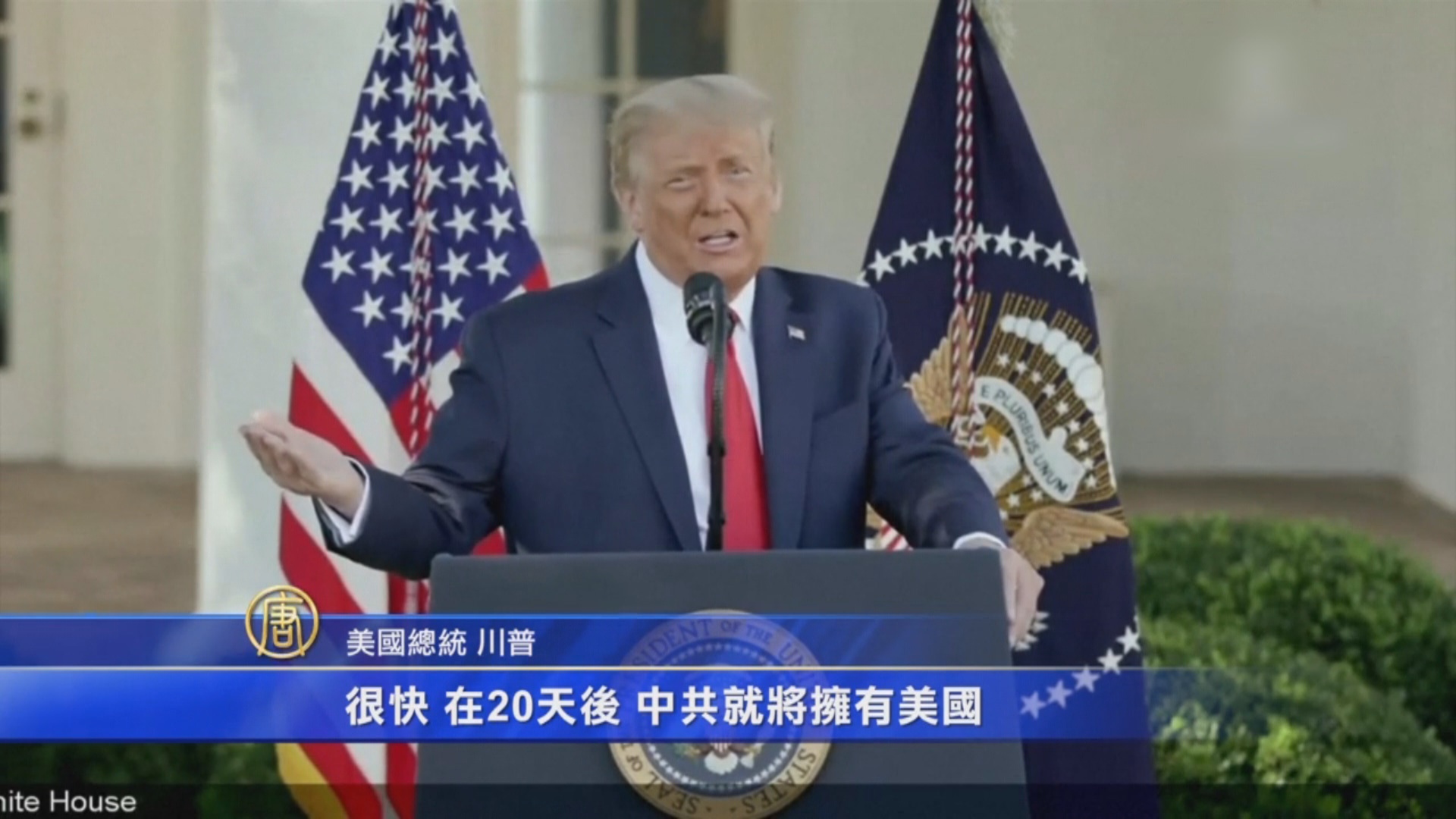 美國總統 川普:「中(共)國向全世界釋放了一種(中共)病毒,只有川普政府才會讓他們承擔責任。如果這屆政府、如果我不能當選,很快,在20天後,中共就將擁有美國。」