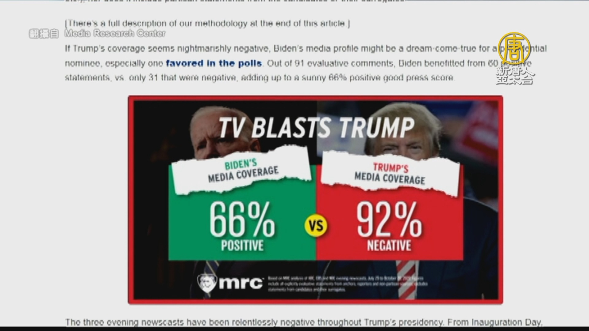 【新唐人亞太台 2020 年 10 月 28 日訊】再來看到,美國媒體研究中心最近發佈了一份調查報告,內容指出,在美國大選的前幾個月,美國三大傳播公司在晚間新聞內容的選擇上非常偏頗,總統川普的負面新聞佔比高達92.4%,然而拜登的負面新聞佔比卻只有34%。報告指出,ABC、CBS及NBC與4年前相比,對川普的攻擊「更為猛烈」,研究總監 諾耶斯指出,這些媒體明無視了可能會傷害到拜登形象的話題,例如最近拜登次子韓特的「電郵門」醜聞。