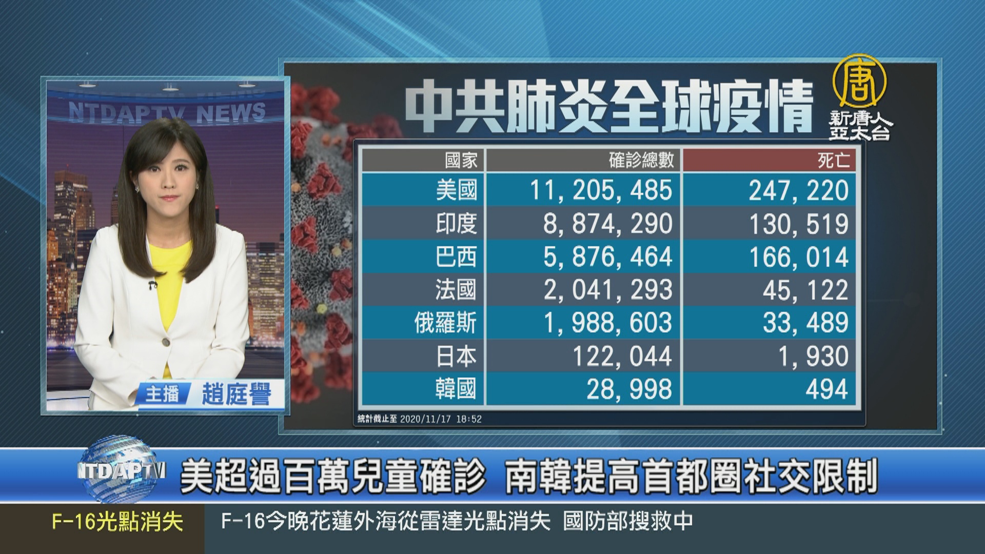【新唐人亞太台 2020 年 11 月 17 日訊】來關心中共肺炎疫情最新情況,全球累計確診超過5千5百萬人,1百32萬8千多人死亡。但中共、伊朗等國家,被認為嚴重低報數據。美國確診達1千1百20萬多萬例,死亡超過24萬7千人,從爆發疫情以來,已有超過1百萬名18歲以下兒童染疫。俄羅斯新增442人死亡,創單日新高,另外還有2萬2千多起確診。日本東京新增298名確診,全日本單日增加1千6百多例。南韓連續4天單日新增超過2百例,從19日起首都圈社交距離限制措施等級將提升到第1.5級。