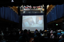 文化部長李永得與現場觀眾一同欣賞首度曝光「臺語、客語、原住民族語流行音樂發展史影音紀錄」影音紀錄精華片段(文化部 提供)