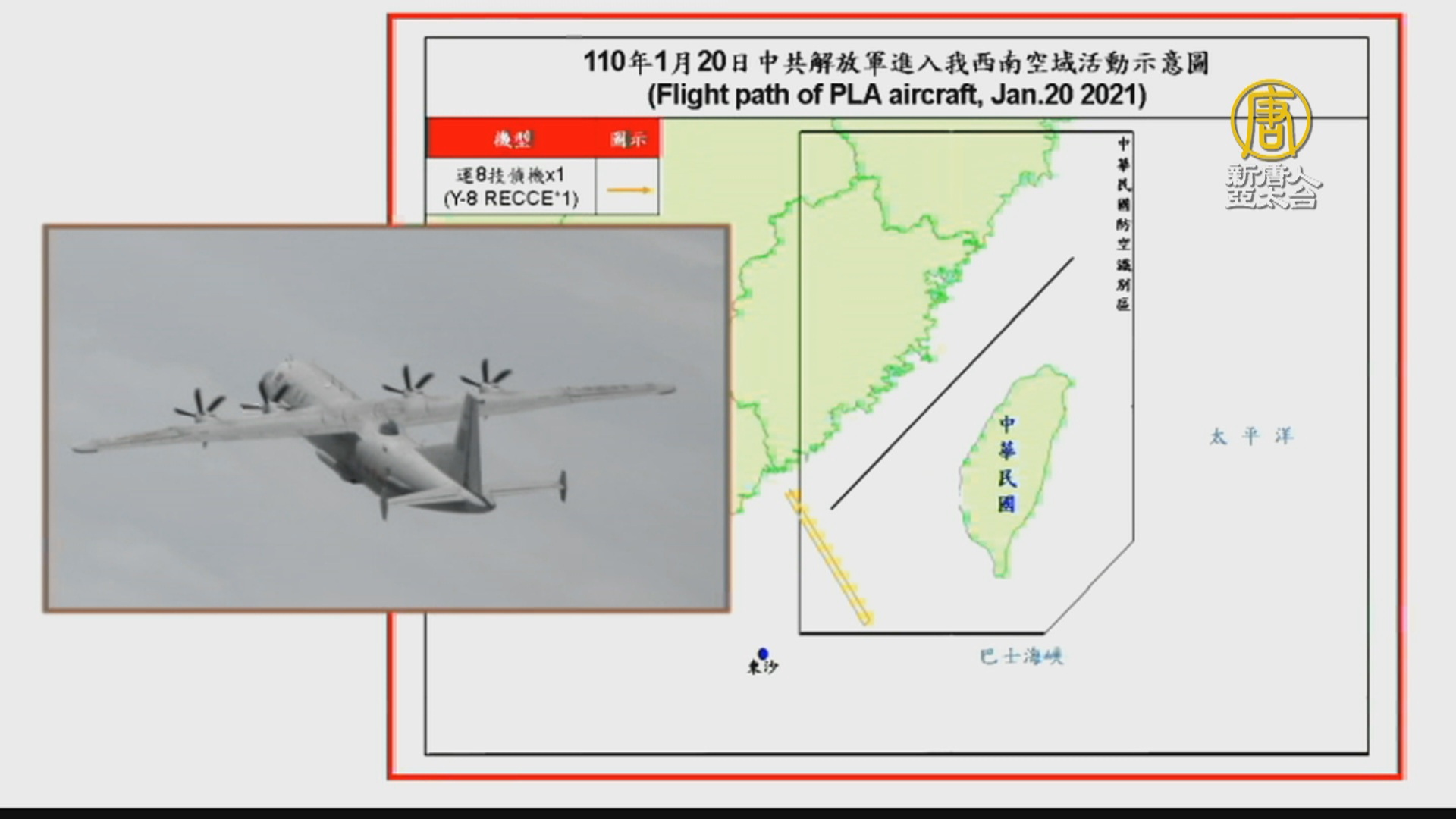 【新唐人亞太台 2021 年 01 月 20 日訊】就在美國政府權力移交之際,中共軍機連續10天侵擾台灣。中華民國國防部發佈,中共20日派出1架運8技術偵察機,進入台灣西南空域活動,台灣的空軍派遣空中巡邏兵力應對、廣播驅離與防空飛彈追監。