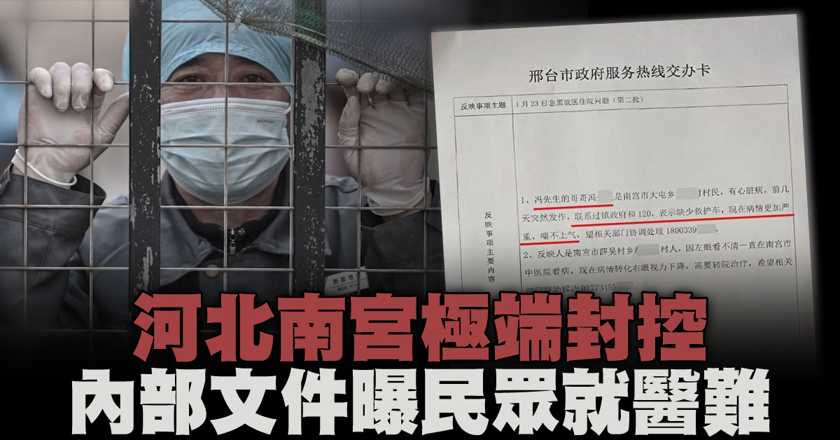 【新唐人亞太台 2021 年 02 月 08 日訊】來關心中國,河北疫情爆發後,因封城釀出大量慘劇。但中共官媒對此幾乎隻字未提。河北省邢台市南宮地區,近日調降為中低風險,卻不見解封跡象,大紀元獨家獲得河北官方內部文件披露,南宮封城後,出現多起百姓無法就醫,以及被困國道的求救案例。