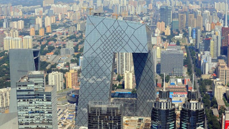 圖為央視大樓。CGTN是中共央視的大外宣。(GOH CHAI HIN/AFP via Getty Images)