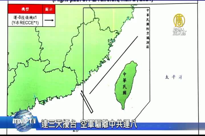 【新唐人亞太台 2021 年 03 月 02 日訊】共機連三天擾台,趁著勇鷹機亮相,今天又有一架中共軍機,闖入台灣空域。國防部晚間發布即時軍事動態,一架中共運-8技術偵察機,在下午闖進台灣西南防空識別區,空軍派遣空中巡邏兵力應對、並以廣播驅離、和啟動防空飛彈追蹤監控。