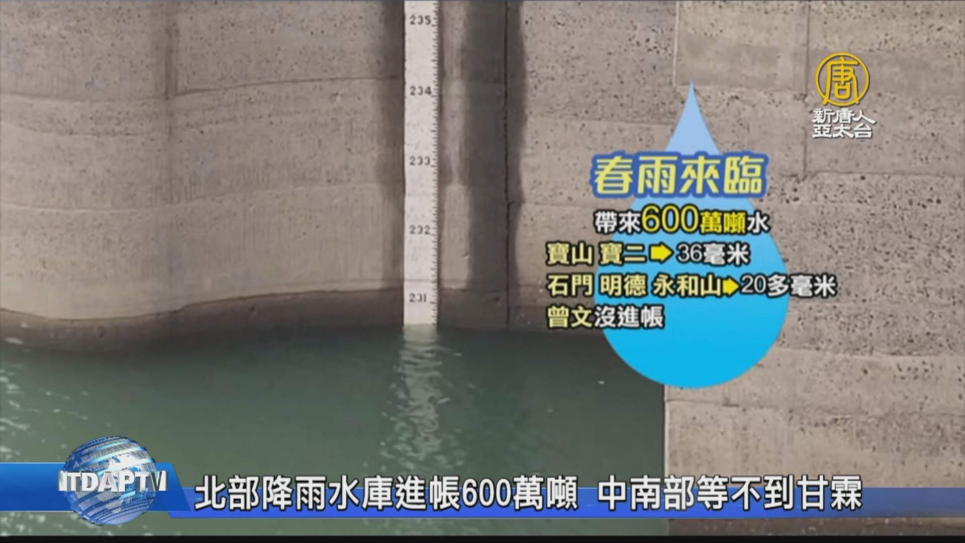 【新唐人亞太台 2021 年 03 月 08 日訊】受到鋒面通過以及東北季風影響帶來降雨,為全國帶來超過600萬噸的水量,水庫稍有進帳,不過雨卻下在北部,水利署統計,6日一天,北部水庫進帳621萬噸水量,但光是新竹一天的用水量就要約100萬噸,只相當於多給新竹地區6天的用水量。