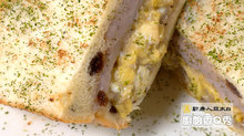 1.組合前,先鋪上保鮮膜,吐司先抹上奶油或美奶滋,一層芋泥一層滑蛋再一層芋泥。內餡可自己調整份量。