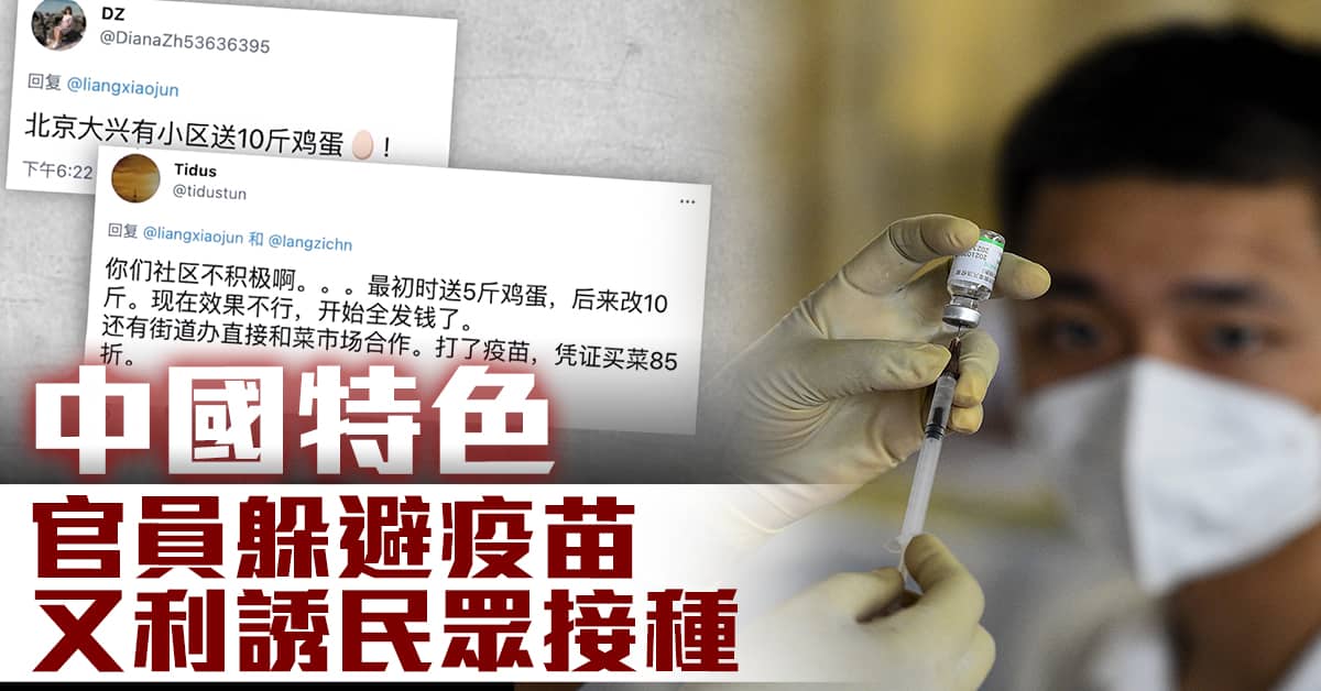 中共當局廣推疫苗接種,民眾不買帳,於是當局再加碼,凡是成功接種疫苗者,贈送100元消費券,還有地區送雞蛋40枚。