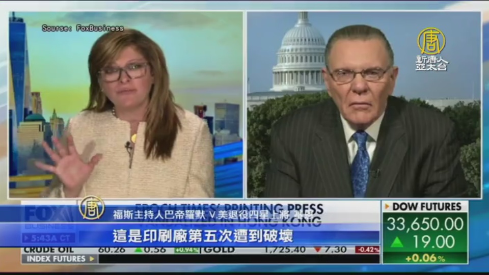 【新唐人亞太台 2021 年 04 月 15 日訊】美國福斯財經網(FoxBusiness)主持人巴帝羅默(Maria Bartiromo),13日在節目關切香港大紀元印刷廠第五次被襲擊,認為是來自中共對美國更多的測試之一。美軍退役四星上將基恩(Jack Keane)表示,大紀元代表著香港殘存的民主聲音,中共要扼殺這一切,黎智英也因此被抓。