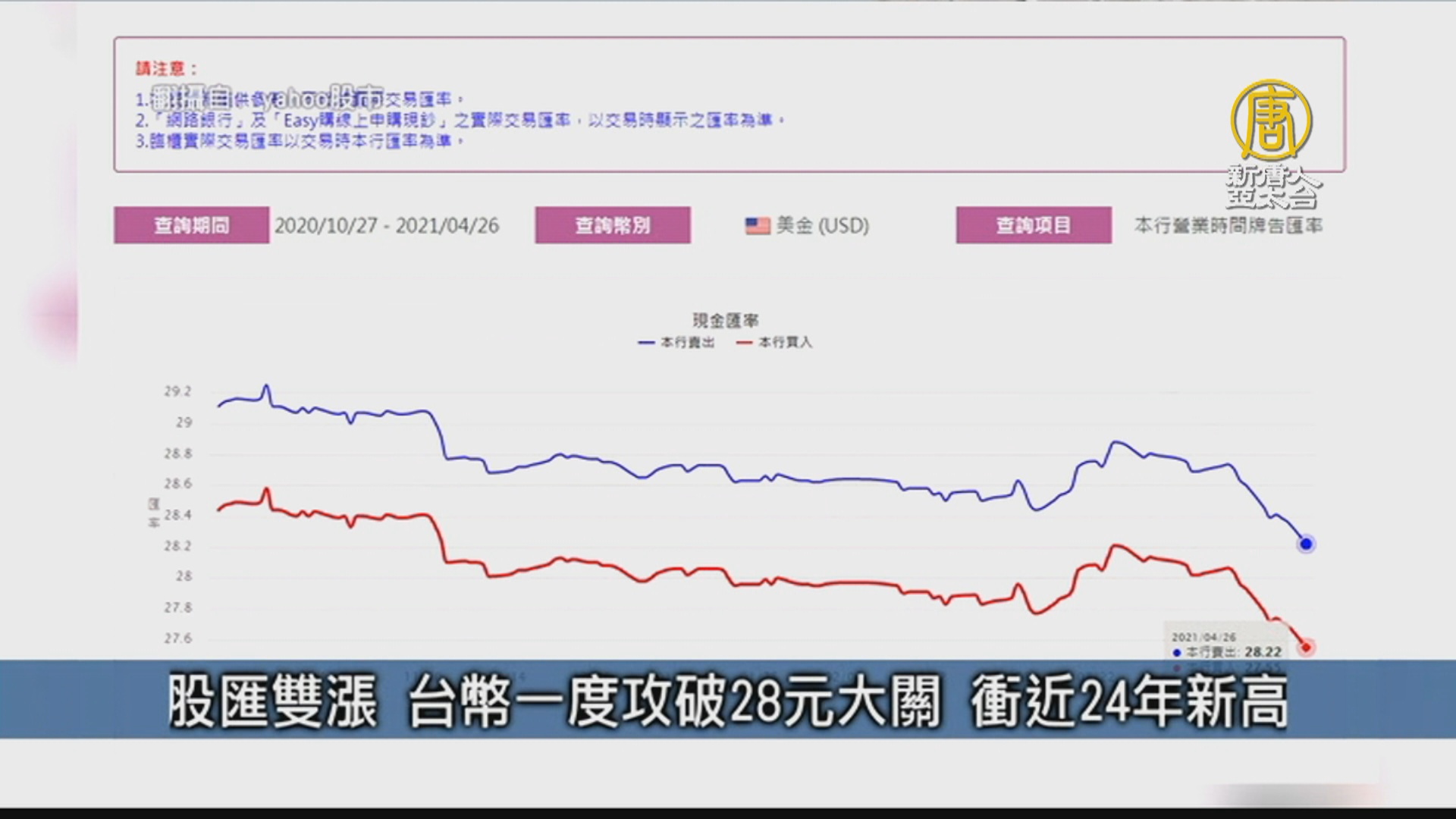【新唐人亞太台 2021 年 04 月 26 日訊】股匯雙漲 台幣一度攻破28元大關 衝近24年新高