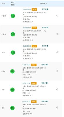 【新唐人亞太台 2021 年 04 月 28 日訊】中央氣象局最新發布,今(28日)清晨4時27分發生芮氏規模4.0地震,至8時8分共連續6震,其中最大震是清晨6時10分,台東縣海端鄉發生芮氏規模4.6地震,震央位於台東縣政府北偏西方50.0公里(台東縣海端鄉),地震深度5.0公里,最大震度高雄市4級。
