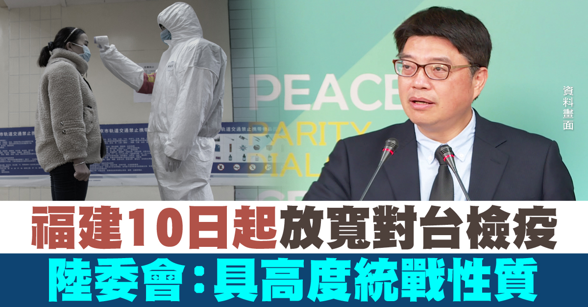 中共福建省政府放寬兩岸隔離新措施,從五月十日起,到福建從事商務、交流等活動的台灣民眾入境只須集中隔離兩天,形同小三通片面有條件解禁,引發兩岸批評。陸委會副主委兼發言人邱垂正今(6)日指出,這是為了落實習近平以福建「通惠情」對台促融工作,具有高度的統戰性質。