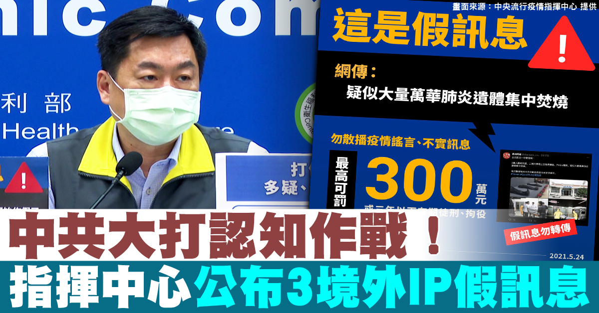 【新唐人亞太台 2021 年 05 月 24 日訊】台灣疫情當前,中共卻以混合戰持續擾台,多起假訊息同步在網路流竄。指揮中心副指揮官陳宗彥(24日)指出,近來有3則來自境外IP帳號傳播的假訊息,而且這些假訊息多半是使用簡體字或中國常用語,另外,專家也指出,這是中共的認知影響力作戰,目的是要製造混亂,分化台灣。