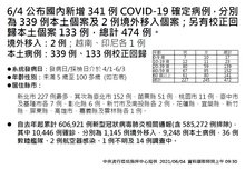 今日新增之339例本土病例,為170例男性、169例女性,年齡介於未滿5歲至100多歲,發病日介於今(2021)年4月1日至6月3日。另校正回歸個案133例中,為57例男性、76例女性,年齡介於未滿5歲至80多歲,發病日介於5月18日至6月2日。