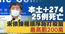 新增274例本土病例、25例死亡 指揮中心訂疫苗施打接種順序