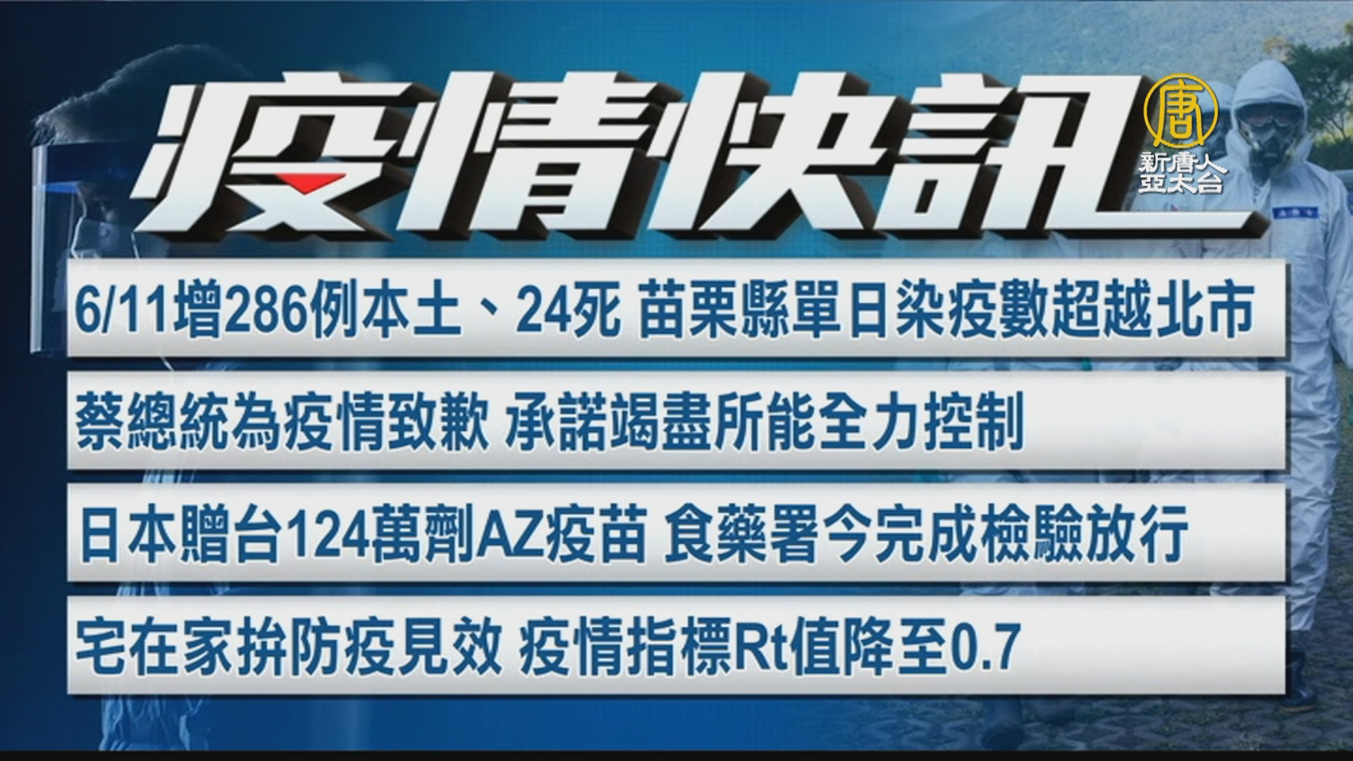 【新唐人亞太台 2021 年 06 月 11 日訊】來看到今天的疫情動態。今天增286例本土、24死,苗栗縣單日染疫數,超越北市。蔡總統為疫情致歉,承諾竭盡所能全力控制。日本贈台124萬劑AZ疫苗,食藥署今天完成檢驗放行。宅在家拚防疫見效,疫情指標Rt值降至0.7。