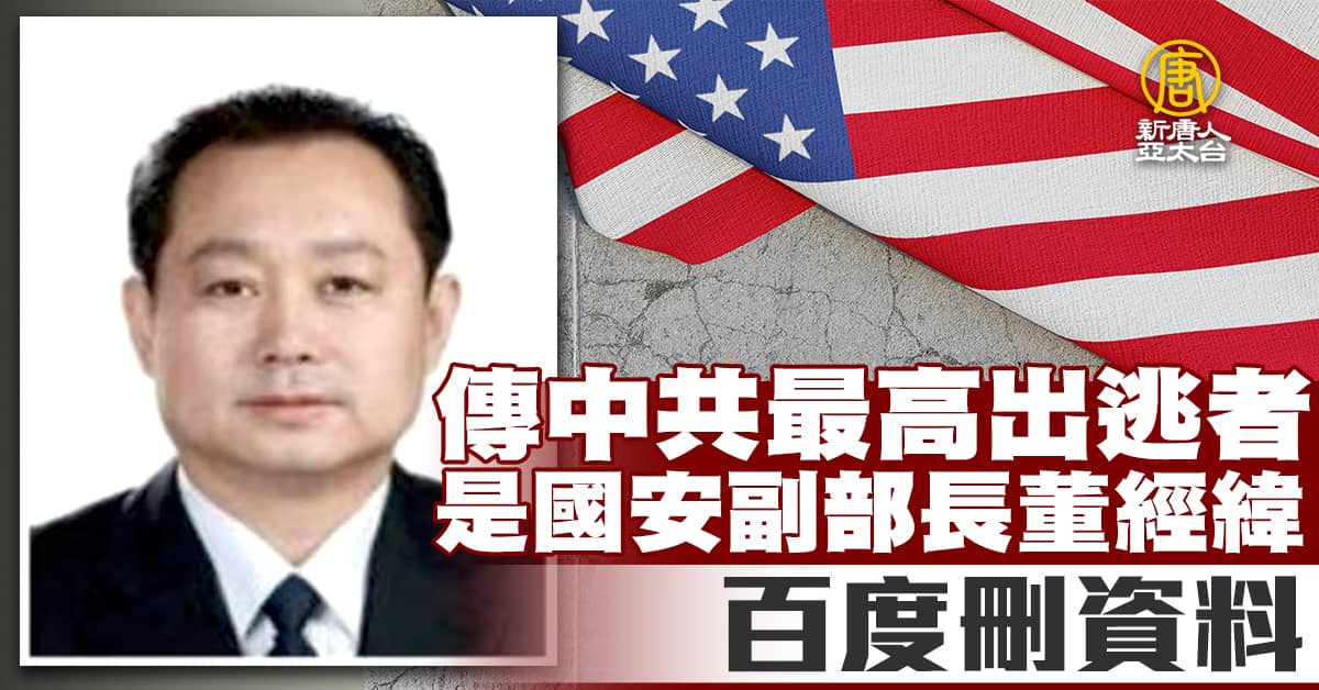 繼美國媒體披露數月前有中共高官投誠並與美國國防情報局(DIA)合作後,日前海外網絡社交平台上盛傳,中共國安部副部長董經緯因涉嫌孫立軍案出逃美國。中國百度百科上目前已清除了這位副部長的個人資料,令華人網友更加懷疑,董某就是美國媒體所披露的投誠高官。