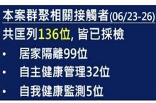因本案群聚相關接觸者衛生局共匡列136人,皆已採檢,其中99人進行居家隔離,32人自主健康管理,5人自我健康監測。