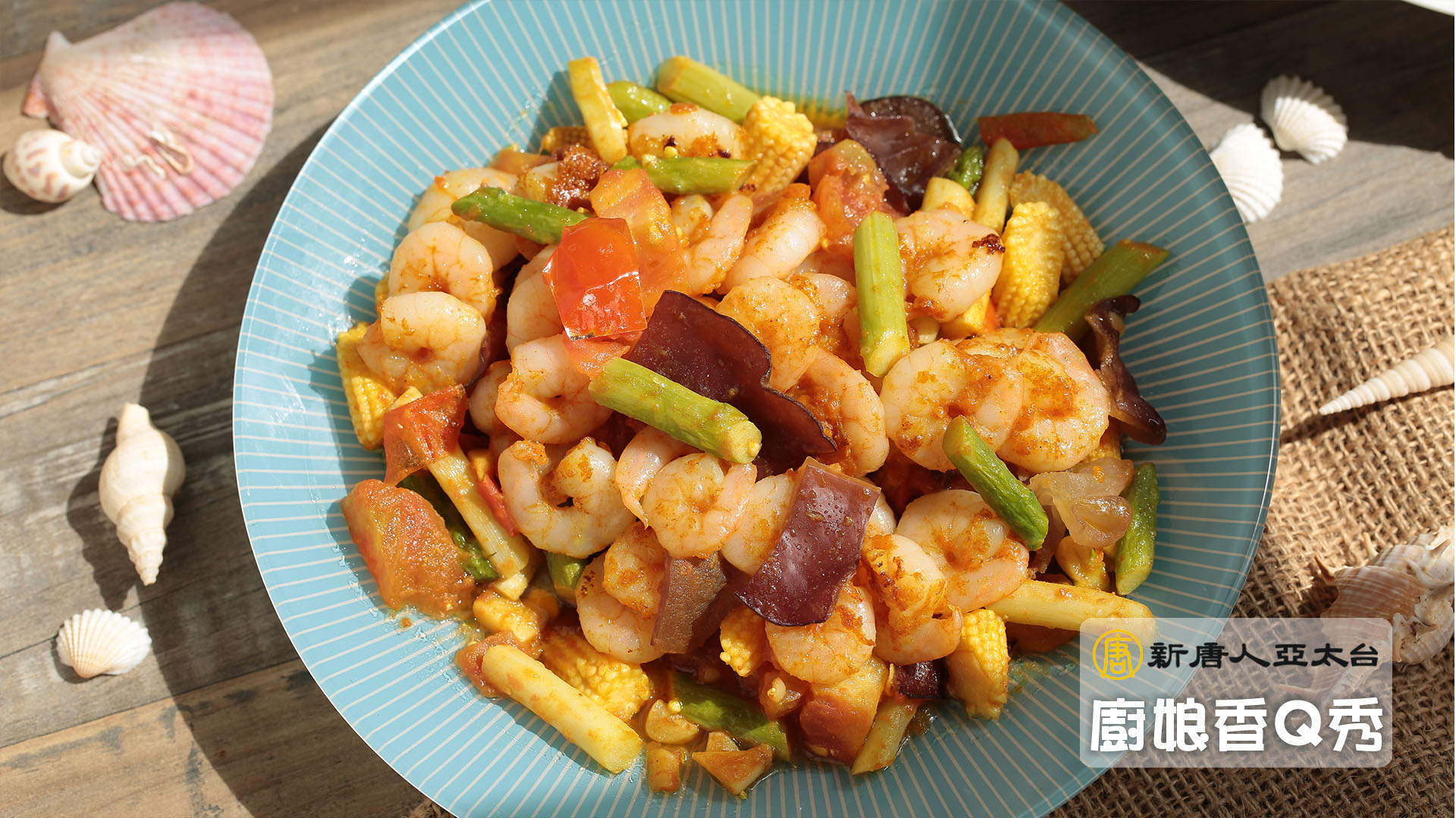 食材:蝦仁300g、牛番茄切塊300g、蘆筍切段100g、玉米筍30g、黑木耳10g、蒜末15g