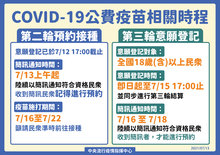 第二輪的意願登記已於昨(12)日17時截止,全國約有285萬人登記,其中約114萬人有意願接種AZ疫苗。系統平臺將自7月13日上午,陸續以簡訊通知符合資格的民眾,提醒收到簡訊民眾記得進行預約;施打期間為7月16日至7月22日,籲請民眾準時前往接種。