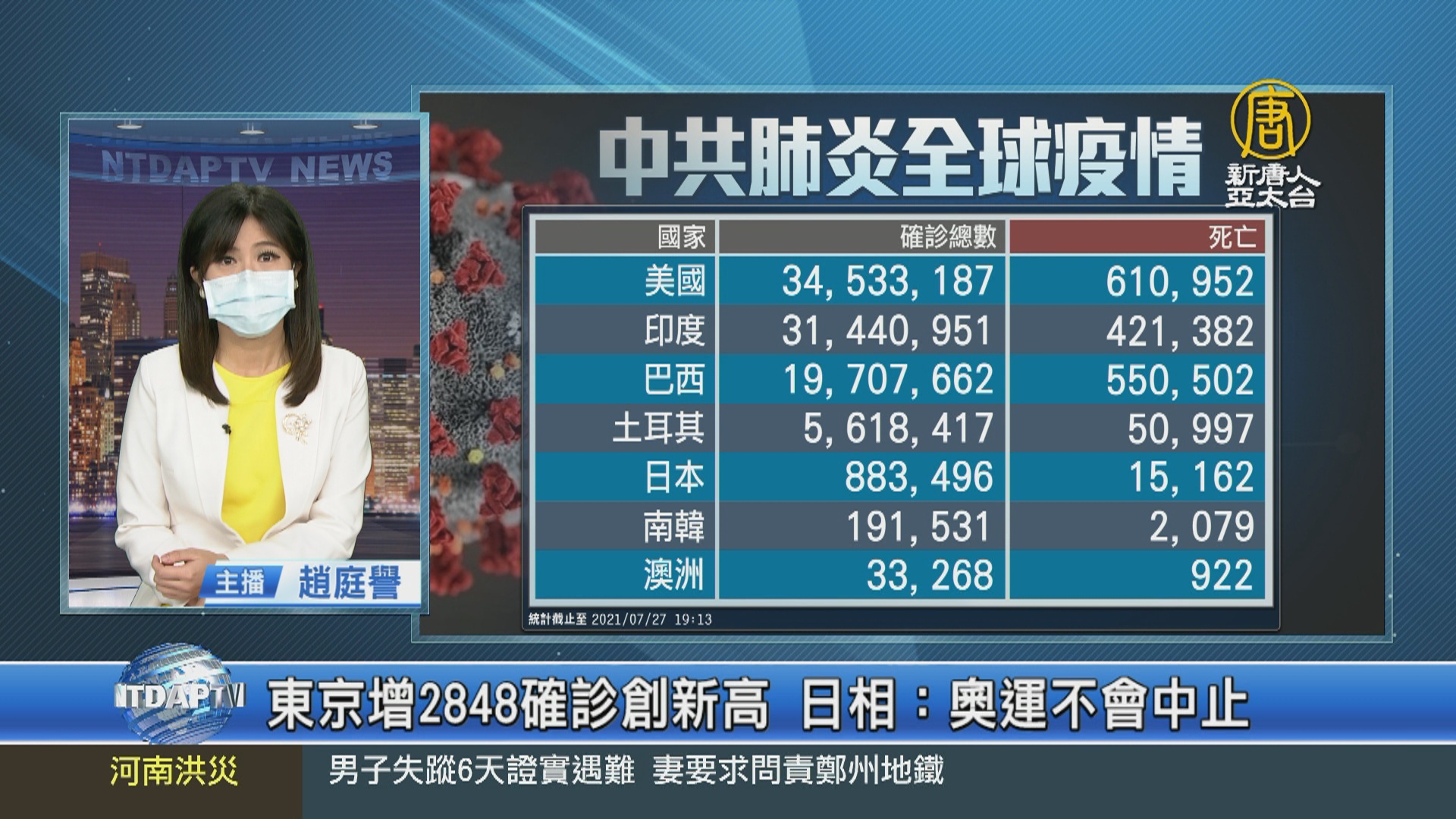 【新唐人亞太台 2021 年 07 月 27 日訊】來關心中共肺炎疫情最新情況,全球確診超過1億9千475萬人,死亡4百16萬7千多人。但中共、伊朗等國家,被認為嚴重低報數據。亞洲方面,日本東京新增2千8百多例確診,沖繩縣新增354 例,雙雙創下單日新高紀錄。南韓再增1千3百多例確診,已經連續3週單日新增確診超過1千例。澳洲第一大洲新南威爾斯,新增確診172例,創16個月以來新高。土耳其26日新增確診1萬6千多例,創下自5月初以來的單日新高。