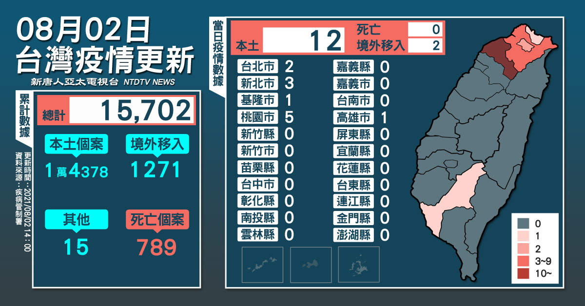 【新唐人亞太台 2021 年 08 月 02 日訊】今(2)日中央流行疫情指揮中心公布,國內新增14例COVID-19確定病例,分別為12例本土及2例境外移入;另確診個案中無新增死亡。
