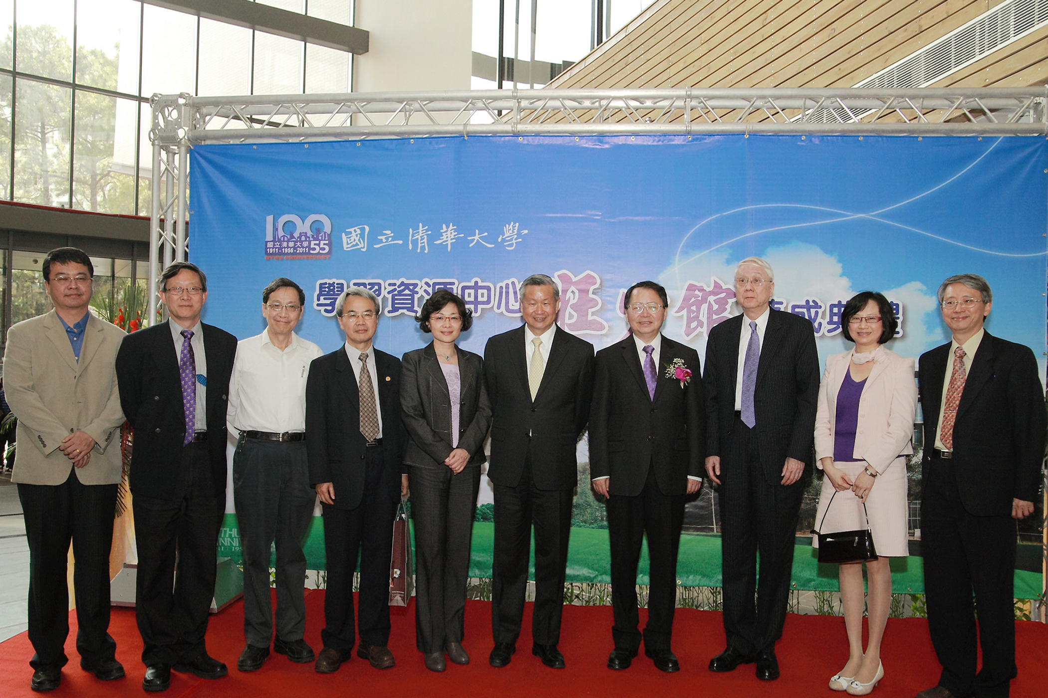 清華前校長劉炯朗(右三)、前校長陳力俊(右四)、旺宏電子董事長吳敏求(右五)及校長賀陳弘(左二)於2011年旺宏圖書館落成典禮合影(清華大學 提供)