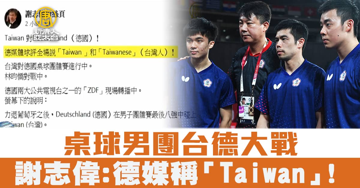 【新唐人亞太台 2021 年 08 月 03 日訊】台灣桌球男團今天(3日)8強賽事對上德國隊,可惜以2比3落敗無緣晉級。同時間,人在德國的駐德代表謝志偉也在觀看這場台德大戰。他在臉書貼文寫道,德國媒體球評在稱呼我國選手的時候,全場都說「Taiwan」和「Taiwanese」台灣人!德國兩大公共電視台之一的「ZDF」現場轉播中的螢幕也提到,這場比賽是力退葡萄牙之後,德國在男子團體賽最後八強中碰上「台灣」。而這也是在東奧中,再有外媒以國名「台灣」直呼中華隊。