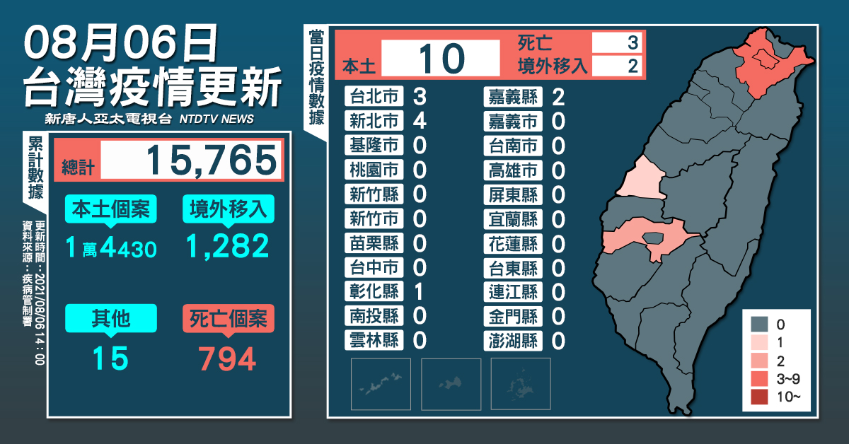【新唐人亞太台 2021 年 08 月 06 日訊】今(6)日中央流行疫情指揮中心公布,國內新增12例COVID-19確定病例,分別為10例本土及2例境外移入;另確診個案中新增3例死亡。