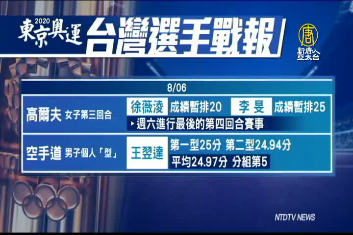 【新唐人亞太台 2021 年 08 月 06 日訊】繼續看到奧運消息,今年台灣表現亮眼,中華隊目前已經拿下2金4銀6銅,在世界排名第25。週五(6日)中華隊有高爾夫及空手道賽事進行,上午,高爾夫球好手徐薇淩和李旻,在女子組第三輪賽事中,徐薇淩拿下平標準桿的71桿,暫時排名第20。李旻則打出高於標準桿1桿的72桿,暫時排名第25。明天兩位選手將進行最後一輪賽事。這也是中華隊週六唯一一場賽事。另外,週五在空手道比賽的部份,王翌達在男子個人「型」賽事中,第一型拿下25分,第二型拿24.94分,2型平均24.97分,以分組第5之姿,無緣下一輪的排名賽。