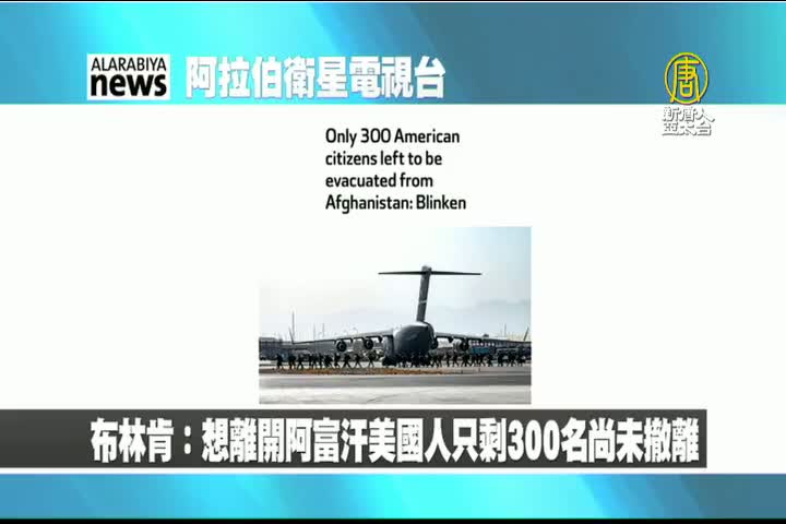 【新唐人亞太台 2021 年 08 月 30 日訊】來看到阿拉伯衛星電視台報導:美國國務卿布林肯表示,想離開阿富汗的美國公民只剩300名尚未撤離。