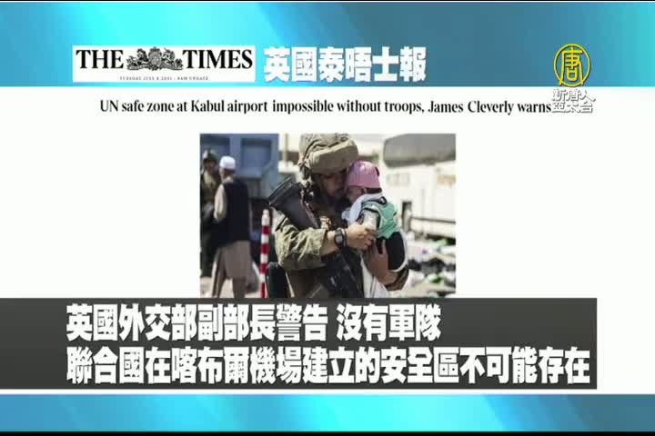 【新唐人亞太台 2021 年 08 月 31 日訊】接著是英國泰晤士報的報導:英國外交部副部長警告,沒有軍隊,聯合國在喀布爾機場建立的安全區不可能存在。