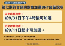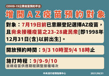 前次(8月29日10時至8月31日12時止)已宣布之符合預約資格對象,包含7月19日前已意願登記選擇AZ疫苗,且尚未接種過疫苗之29歲(含)以上對象[即1992年12月31日(含)以前出生]及滿18歲以上[即2003年9月3日(含)前出生]第九類對象,依原預約期程,已於8月31日中午12時停止預約及修改。