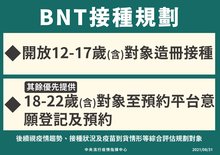 針對BNT疫苗到貨後接種對象,已規劃採校園集中接種或依通知書至地方政府衛生局指定合約醫療院所方式,開放12歲至17歲(含)對象造冊接種,其餘將優先提供預約平臺意願登記,且尚未接種過疫苗之18至22歲(含)民眾預約接種。
