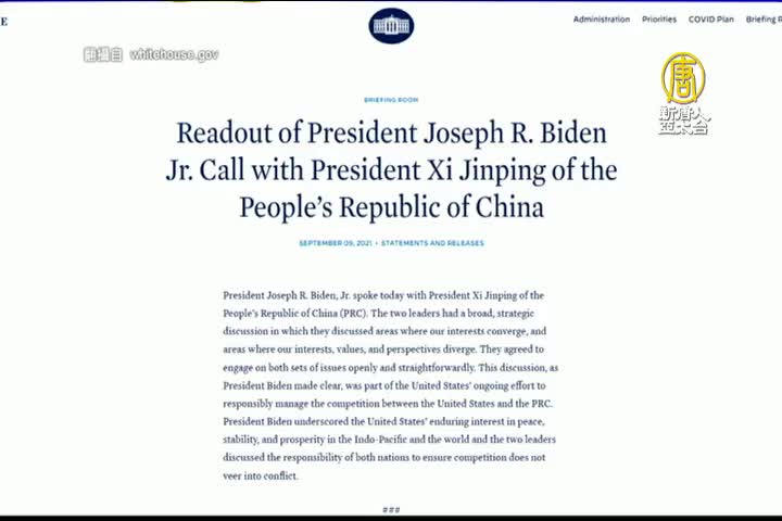 【新唐人亞太台 2021 年 09 月 10 日訊】美中關係緊張,時隔七個月,美國總統拜登與中共國家主席習近平,進行任內第二次對話,白宮官網指出,拜登強調美國對印太地區與世界和平、穩定與繁榮的長久利益,兩人也討論兩國確保競爭不會陷入衝突的責任。