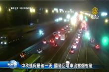 【新唐人亞太台 2021 年 09 月 17 日訊】明天就是一連4天的中秋節假期,交通部高公局預估,是連假期間國道交通量最大的一天,國道全線交通量估125百萬車公里,行車時間可能需平時的3倍至5倍。不過,國道今天下午3點後已陸續湧現南下車潮,部分路段車速更是低於40公里,台北、桃園、新竹、台中等都會區,下午5點後結合下班車潮,出現嚴重壅塞情況。國5車流量約增1500輛次左右,晚間9點,石碇到頭城開始車多,車速只有50公里,高公局特別提醒晚上才是今日最壅塞的情況,提醒民眾出發前可先查詢最新路況資訊。