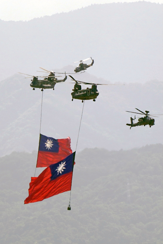 AH-64E阿帕契直升機、AH-1W超級眼鏡蛇直升機、UH-60M黑鷹直升機及海軍S-70C反潛直升機等陸續登場,隨後B-1900行政專機、C-130H運輸機所組成的慢速機隊,也飛越總統府上空;另外,空軍主力戰機經國號IDF、F-16V與幻象2000戰機以各5架編隊方式,飛越總統府上空,巨大戰機引擎聲相當震撼。