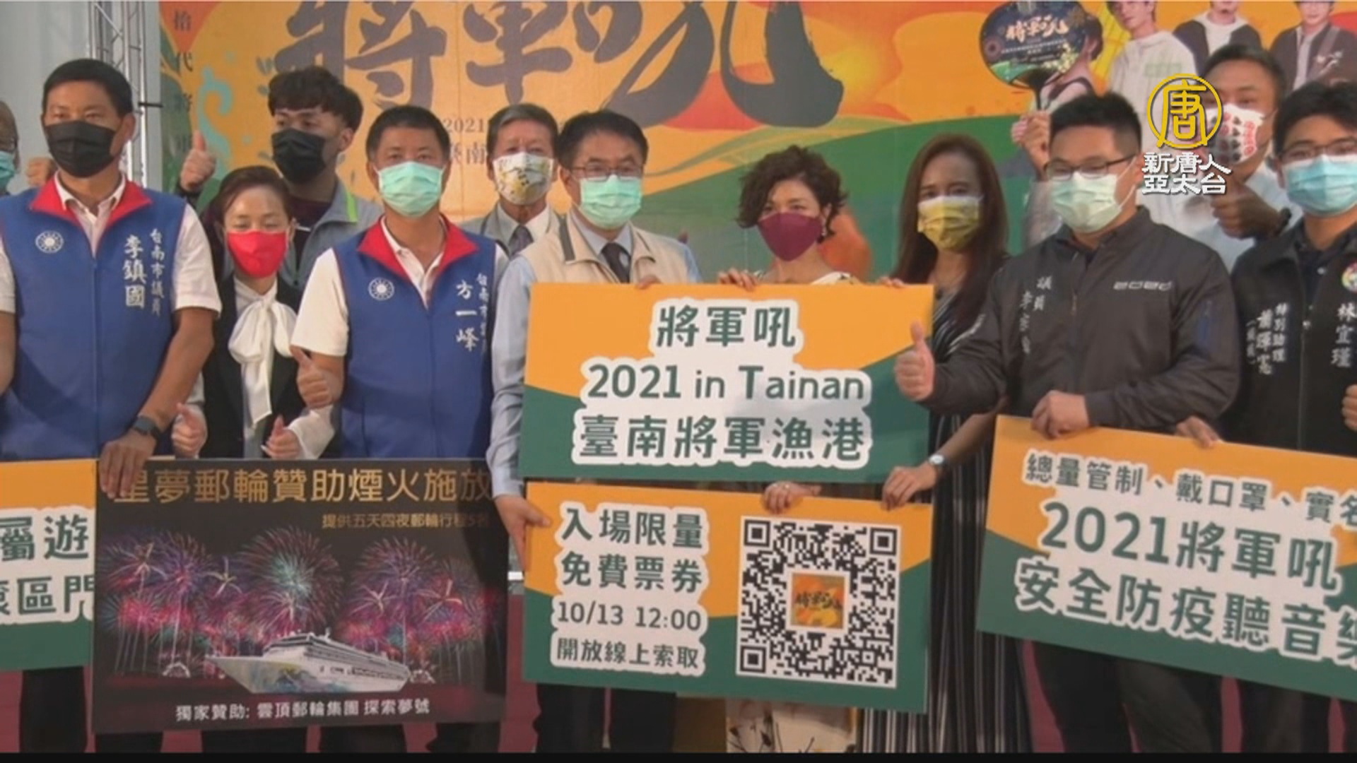 【新唐人亞太台 2021 年 10 月 12 日訊】邁入第10年的「台南將軍吼音樂節」,將在下個周末(10月23、24日)兩天在將軍漁港登場,邀請時下知名歌手及樂團,登台演出,最後一天還會有6分多鐘、總發數1萬6265發的焰火秀,期許疫情早日退散。台南市府週二(12日)的宣傳記者會上,也找來原本是錦繡二重唱組合的台劇演員于子育,現場小秀一段。