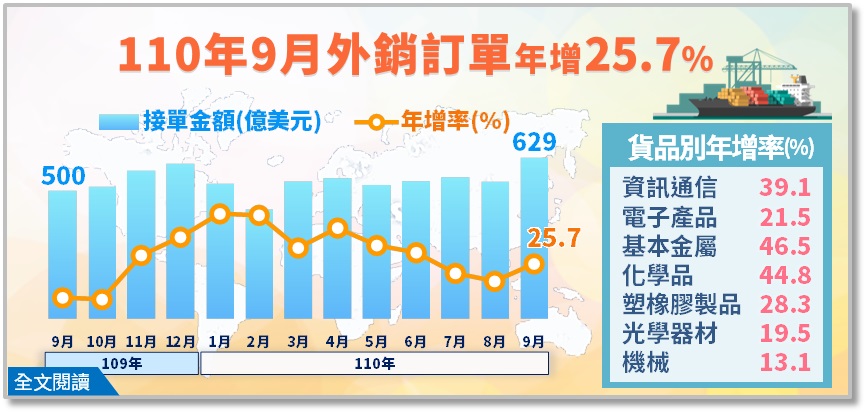 展望未來,統計處表示,短期仍有疫情、中國能耗雙控風險存在,但隨疫苗覆蓋率提高,主要國家擴大基礎建設,仍有利支撐全球經貿成長,加上第四季進入歐美年終銷售旺季,消費性電子備貨需求漸次釋出,另5G、高效能運算、車用電子等新興科技應用持續擴增,以及國際原材物料價格維持高檔,均有助於外銷接單穩定成長。