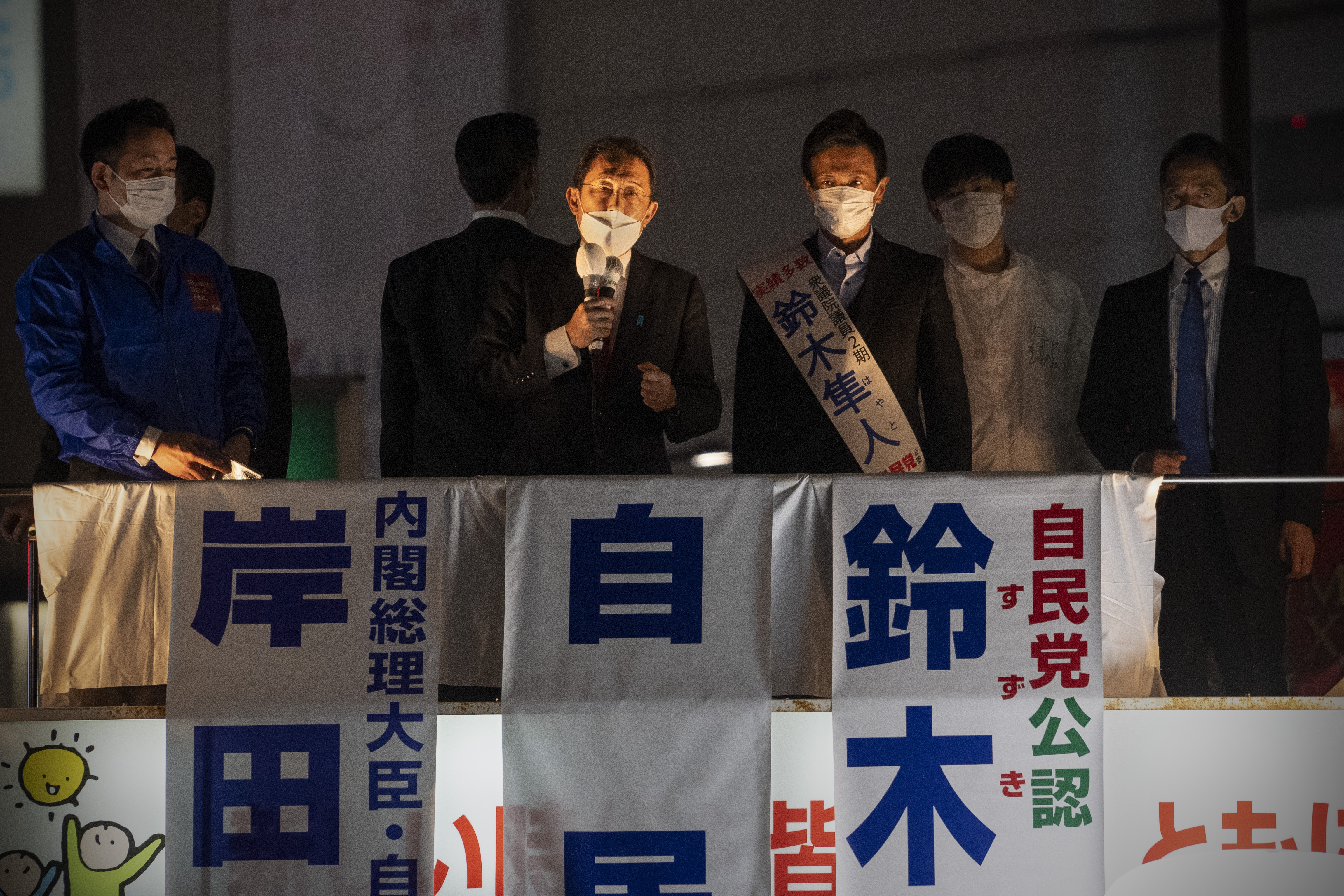 日本眾議院大選將於31日投開票,鑒於疫情使內閣支持度不振,首相岸田文雄的選戰目標是執政黨自民黨與盟友公明黨合計席次過半,但實際上恐怕自民黨得單獨過半才算真正勝選。圖為27日,岸田文雄(持麥克風者)在東京為眾議員鈴木隼人(身著肩帶者)助選。(圖/GettyImages)