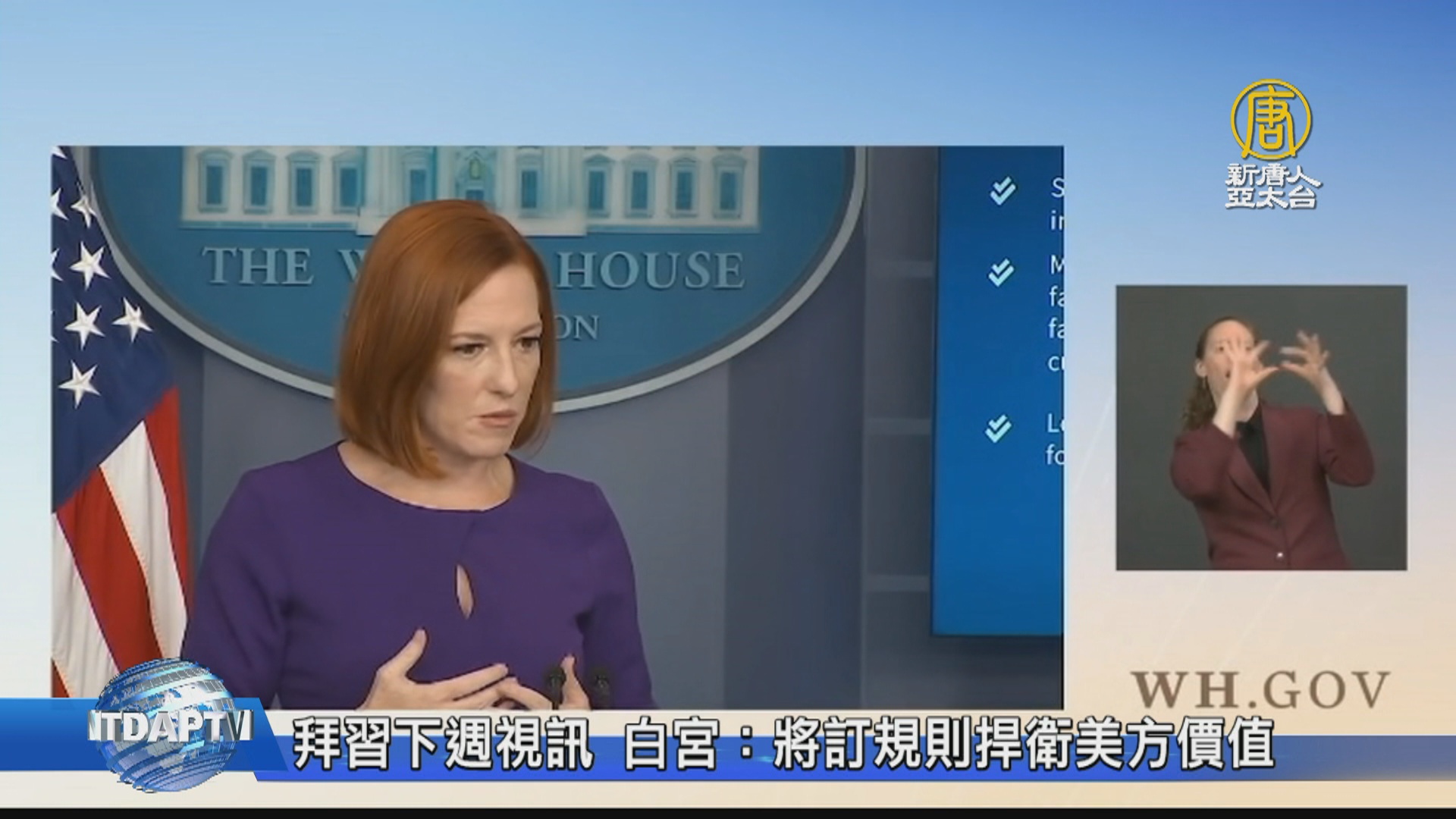 【新唐人亞太台 2021 年 11 月 13 日訊】好,美國總統拜登與中共領導人習近平,將於美東15日晚間舉辦視訊會議,白宮發言人莎琪12日強調,美方的目的不尋求特定成果,而是要在會議中為美中競爭訂定規則,捍衛自身價值。