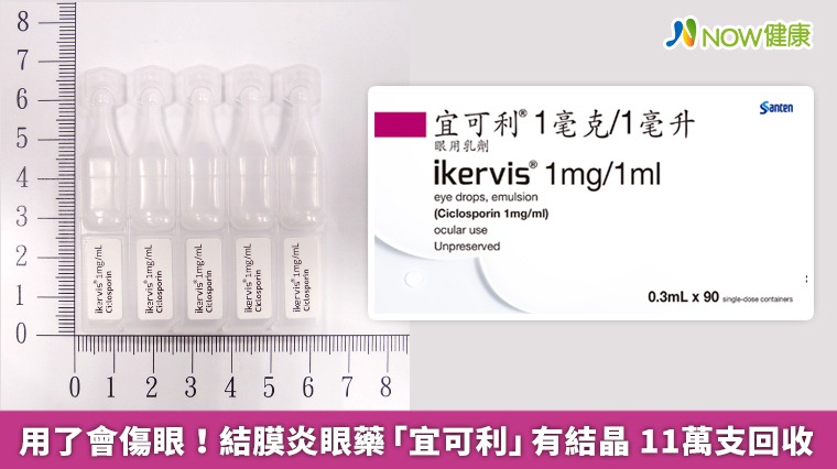 由台灣參天製藥進口的「宜可利1毫克/1毫升眼用乳劑」(Ikervis 1mg/1mL eye drops, emulsion)主成分為Ciclosporin,主要用於治療嚴重乾性眼角結膜炎(Schirmer test without anesthesia<5mm/5min)併角結膜上皮病變患者之發炎反應,但在目前使用局部抗發炎藥物或使用淚點塞病患未見療效者。主要用於4歲以上兒童至18歲青少年之嚴重春季型角膜結膜炎(VKC)。本次為廠商主動通報乳劑內有結晶體析出,啟動回收。