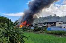 2021年11月26日,荷尼阿拉(索羅門首都)唐人街的建築物升起火焰,因為連續幾天的騷亂導致數千人無視政府的封鎖令,燒毀了唐人街地區周圍的幾座建築物,包括商業地產和一家銀行分行。資料照。(圖/GettyImages)