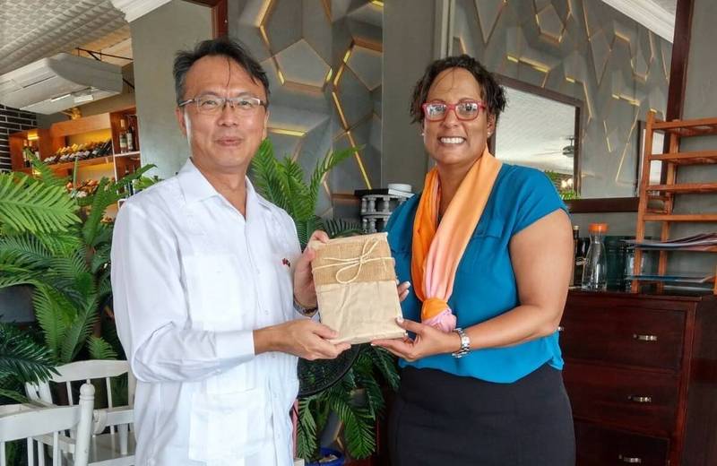 2021年7月15日,中華民國駐貝里斯大使錢冠州會晤貝里斯國會眾議長伍姿(Valerie Woods),雙方相談甚歡。(圖/擷取自中華民國駐貝里斯大使館臉書)