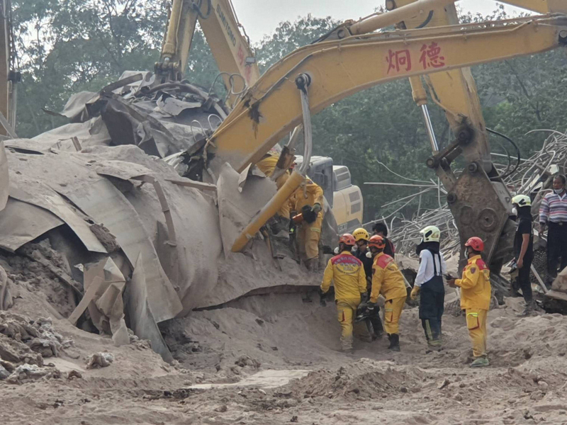 高雄市仁武區東南水泥廠30日上午拆除水泥塔時發生工安意外,1名工人和怪手連人帶機具遭倒塌噴霧塔掩埋,被救出時已無生命跡象,送醫搶救中。 (圖/高市楠梓警分局提供)