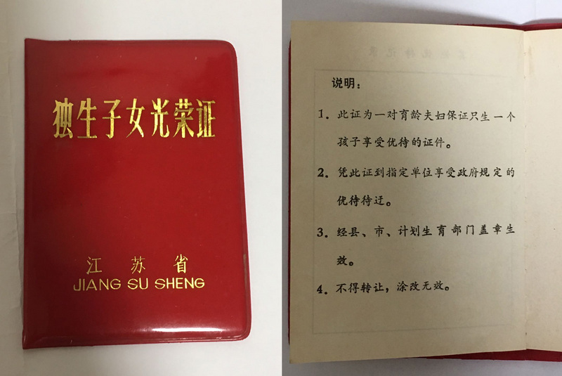 中共為了減少人口,曾強制推行「一胎化」政策 30餘年,並授予獨生子女「光榮證」,每月給予補貼。(圖/張曉靚提供)