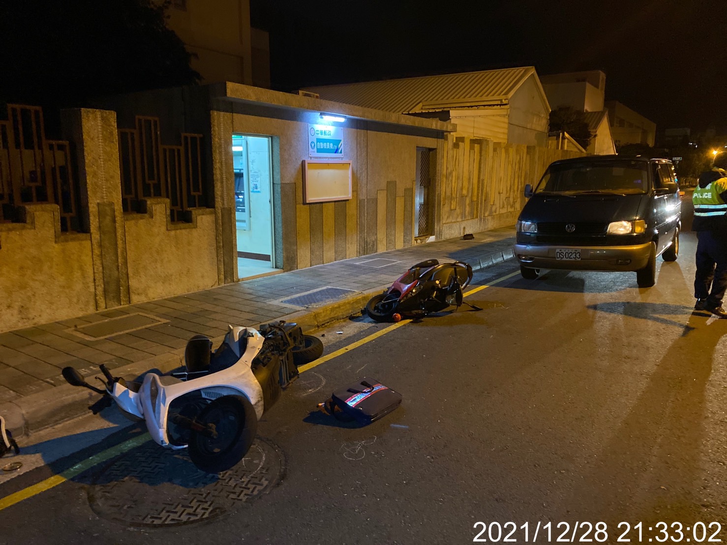 【新唐人亞太台 2021 年 12 月 29 日訊】澎湖一自小客貨車駕駛,28日晚間行經馬公國小側門道路時,追撞前方同方向普重機車,導致該機車再碰撞另一台停放在路旁的普重機車;造成機車駕駛人身體多處擦挫傷。
