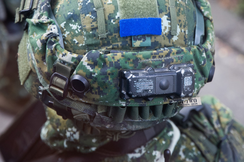演練官兵於頭盔後方裝設「單兵雷射偵測模組」,再配合實兵模擬接戰系統,得知官兵演練實況狀況。(圖/中央社)